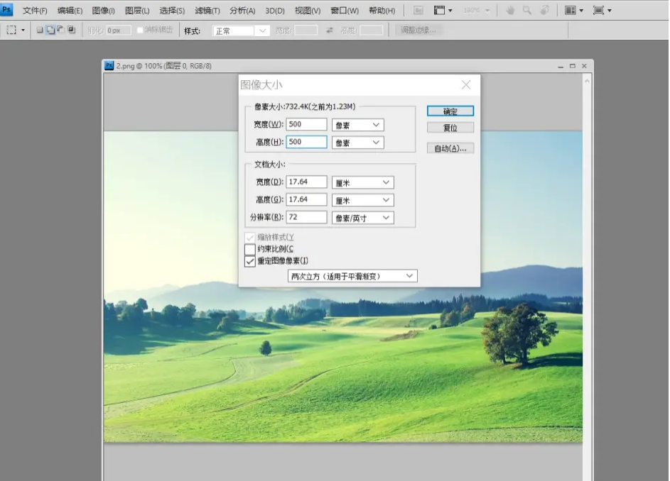第二步,在菜单栏中选择“图像”-“图像大小”,会弹出一个对话框;在对话框中,可以设置图片的宽度、高度、分辨率和图像大小等参数。如果您想调整图片的长和宽比例,需要勾选“约束比例”选项;