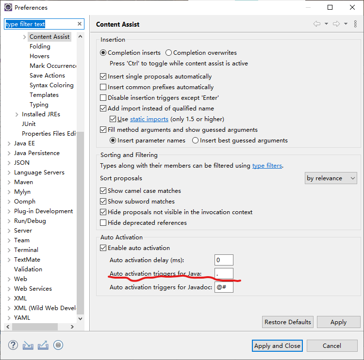 “Window”——>"preferences"——>"Java"——>"Editor"——>"Conttent Assist"