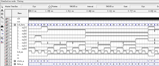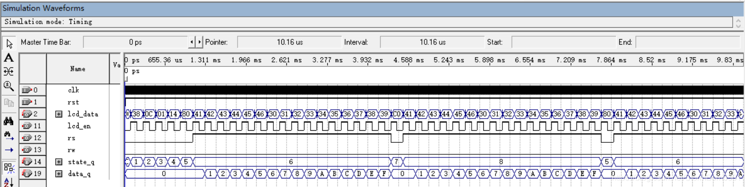 (6)点击Processing→Simulator Tool,打开lcd1602.vmf文件,仿真模式选择Timing,仿真并报告,波形输出如下图所示。
