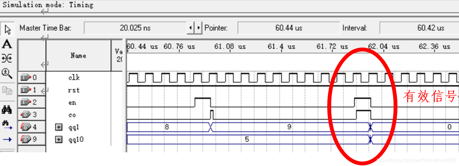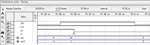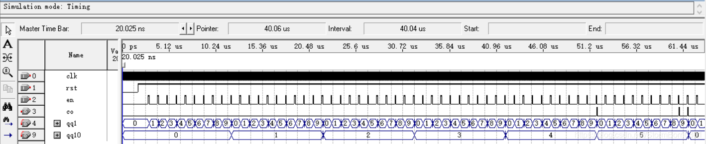 (6)点击Processing→Simulator Tool,打开cnt60.vmf文件,仿真模式选择Timing,仿真并报告,波形输出如下图所示。