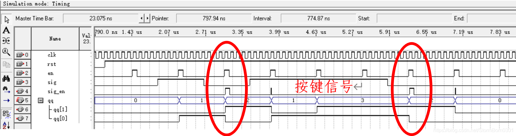 每个En高电平来临时,都将qq寄存器低位中的值移入高位中,并将当前sig值置入qq寄存器低位中。当qq中值为b10时,即按键按下输入低电平信号时,输出一个sig_en高电平信号。