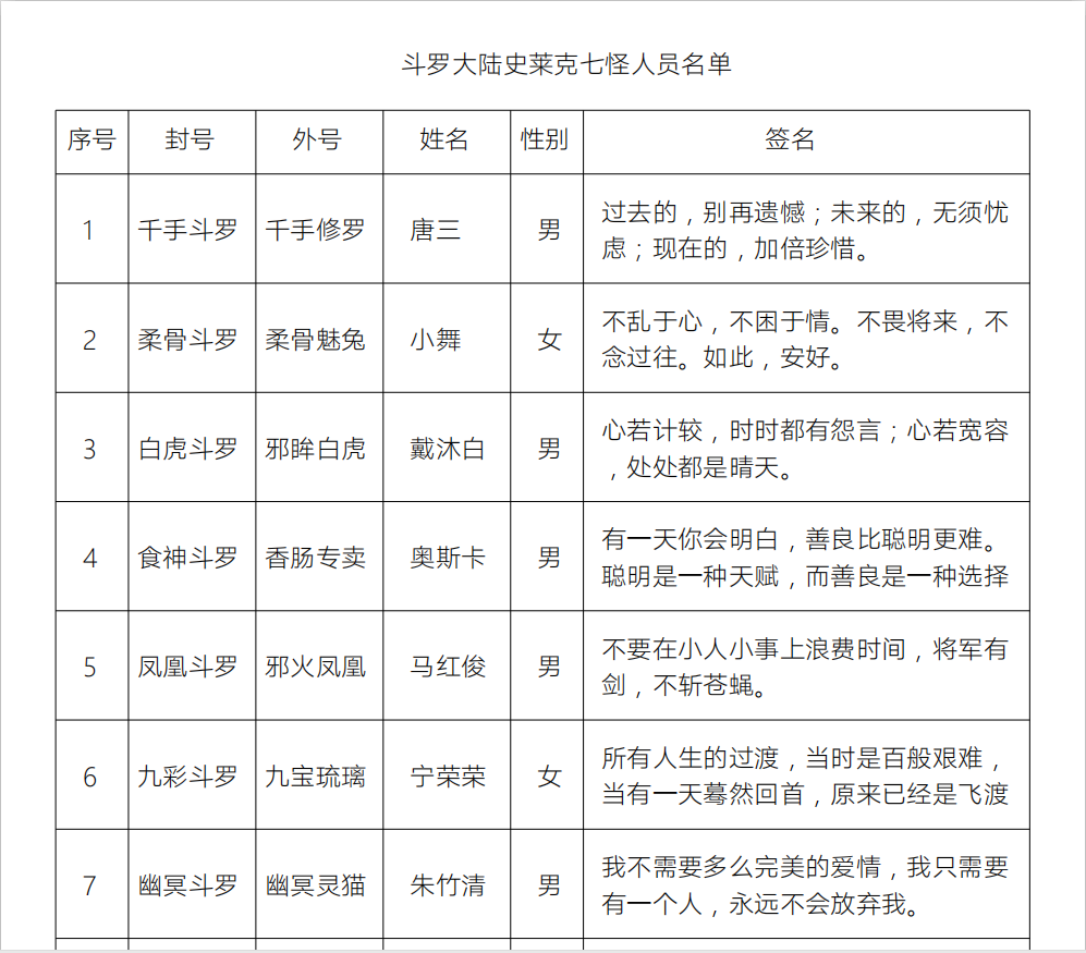 }func WritePdf(filePath string, data []*defs.MemberInfo) error {// 创建路径err = comm.CreateFilePath(filePath)if err != nil {log.Printf("%s", err.Error())return err}pdf := gopdf.GoPdf{}defer pdf.Close()pdf.Start(gopdf.Config{PageSize: *gopdf.PageSizeA4})pdf.AddPage()page = page + 1 //err := pdf.AddTTFFont("msyh", "./pdf/ttf/MicrosoftYaqiHeiLight-2.ttf") // 添加字体文件if err != nil {return err}err = pdf.SetFont("msyh", "", 14) // 设置字体和大小if err != nil {return err}pdf.SetLineWidth(0.5) // 设置线宽度pdf.SetLineType("normal") // 设置线类型pdf.SetX(220)pdf.SetY(40)pdf.Text("斗罗大陆史莱克七怪人员名单")pdf.Line(30, 60, 565.28, 60) // 表单顶部pdf.Line(30, 60, 30, 815) // 表单左1pdf.Line(70, 60, 70, 815) // 表单左2pdf.Line(140, 60, 140, 815) // 表单左3pdf.Line(210, 60, 210, 815) // 表单左4pdf.Line(280, 60, 280, 815) // 表单左5pdf.Line(320, 60, 320, 815) // 表单左6pdf.Line(565.28, 60, 565.28, 815) // 表单右1pdf.Line(30, 815, 565.28, 815) // 表单底部for i := 0; i <= 12; i++ {pdf.Line(30, 35+60*float64(i+1), 565.28, 35+60*float64(i+1)) // 生成每行线}// 表单头部pdf.SetX(36)pdf.SetY(70)pdf.Cell(nil, "序号")pdf.SetX(90)pdf.SetY(70)pdf.Cell(nil, "封号")pdf.SetX(160)pdf.SetY(70)pdf.Cell(nil, "外号")pdf.SetX(230)pdf.SetY(70)pdf.Cell(nil, "姓名")pdf.SetX(285)pdf.SetY(70)pdf.Cell(nil, "性别")//pdf.SetX(420)pdf.SetY(70)pdf.Cell(nil, "签名")// 主体for k, val := range data {pdf.SetY(120 + float64((k)*60))pdf.SetX(45)pdf.Cell(nil, strconv.Itoa(k+1))pdf.SetX(75)pdf.Cell(nil, val.Username)pdf.SetX(145)pdf.Cell(nil, val.Nickname)pdf.SetX(225)pdf.Cell(nil, val.Realname)pdf.SetX(295)pdf.Cell(nil, val.Sex)tipSlcie := getSliceByString(val.Signature)tiplen := len(tipSlcie)pdf.SetX(330)pdf.SetY(110 + float64((k)*60))pdf.Cell(nil, getStringFormSliceString(tipSlcie[0:16]))if (tiplen >= 16) {pdf.SetX(330)pdf.SetY(130 + float64((k)*60))pdf.Cell(nil, getStringFormSliceString(tipSlcie[16:32]))}}err = pdf.WritePdf(filePath)return err