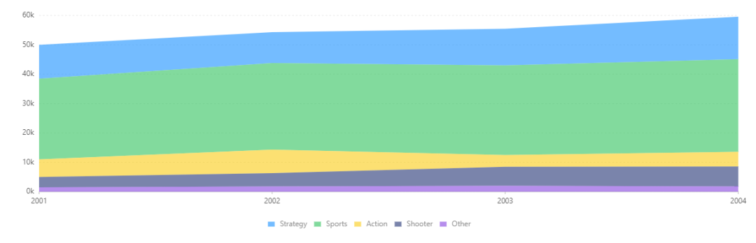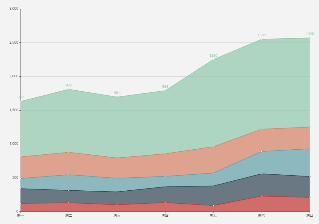 常规面积图适合表现总量和分量之间的关系,比如总量是总用户量,而分量是各个渠道的用户,那么选用面积图较为合适