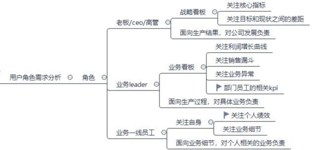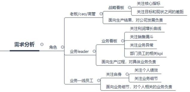 数据看板是公司内所有人员都会关注的,无论是公司高层还是基层业务操作者都会关注相关的数据指标。只是不同的角色的需求不同,如下图: