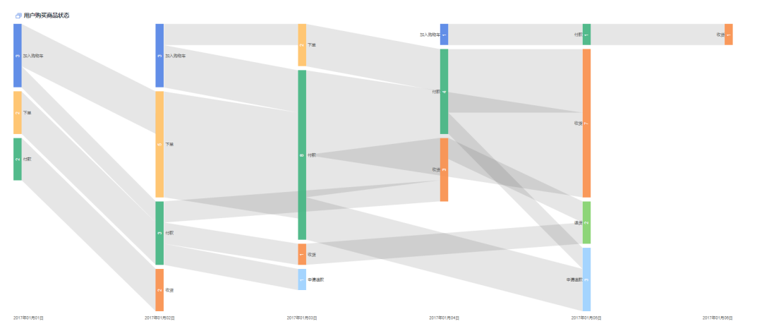 桑基图能够很好地表示用户从加入购物车到收获的全流程,主支宽度总和与分支宽度总和相等,不同宽度代表不同流量的大小。