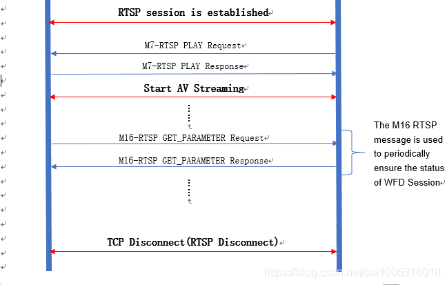 4、如果WFD Source在timeout时间内没有接收到RTSP M16 Response,则WFD Source会断开RTSP和RTP连接,同样如果WFD Sink在timeout时间内没有接收到RTSP M16 Request,则WFD Sink也会断开RTSP和RTP连接。