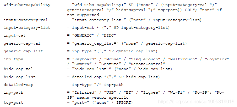 例如:wfd_uibc_capability: input_category_list=HIDC;generic_cap_list=Keyboard, Mouse;hidc_cap_list=Keyboard/USB, Mouse/USB;port=46531\r\n