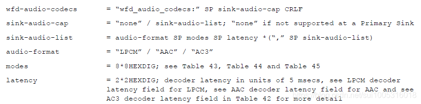 例如:wfd_audio_codecs: LPCM 00000003 00, AAC 0000000f 00, AC3 00000007 00\r\n