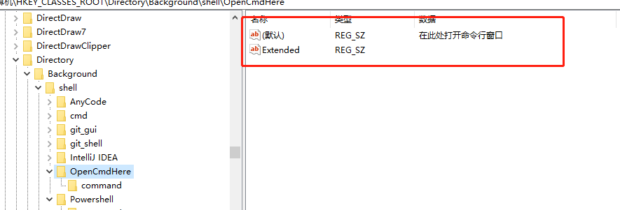 [HKEY_CLASSES_ROOT\Directory\Background\shell\OpenCmdHere]@="在此处打开命令行窗口""Extended"=""[HKEY_CLASSES_ROOT\Directory\Background\shell\OpenCmdHere\command]@="cmd.exe -noexit -command Set-Location -literalPath '%V'"