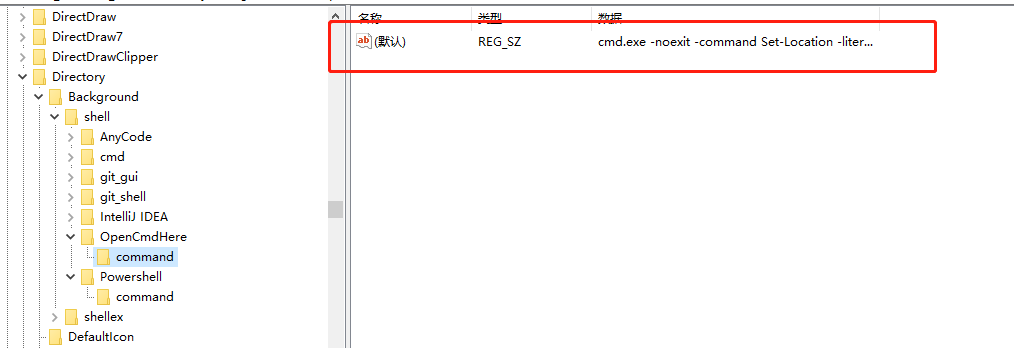 Win+R ,打开 regedit 注册表,按步骤一的路径 HKEY_CLASSES_ROOT\Directory\Background\shell\OpenCmdHere\command ,可以看到步骤一执行的命令结果。
