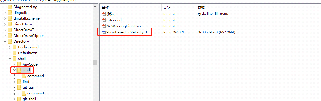 切换注册表路径至HKEY_CLASSES_ROOT\Directory\shell,可看到cmd 和powershell 分别有两个DWORD键叫HideBasedOnVelocityId,ShowBasedOnVelocityId,将cmd的HideBasedOnVelocityId键重命名为ShowBasedOnVelocityId即可