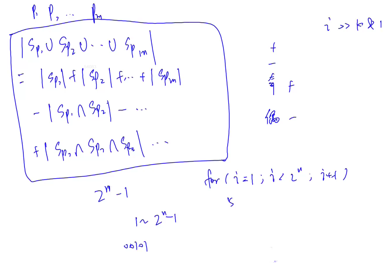 {cin >> n >> m;for(int i = 0; i < m; i ++)cin >> p[i];int res = 0;for(int i = 1; i < 1 << m; i ++)//运用二进制枚举所有集合 01110 1是被枚举到的 {int t = 1, cnt = 0;//t 质数的乘积,cnt质数的个数for(int j = 0; j < m; j ++){if(i >> j & 1) {cnt ++;if((LL)t * p[j] > n){t = -1;break;}t *= p[j];} } if(t != -1){if(cnt % 2) res += n / t;else res -= n / t;}}cout << res;return 0;