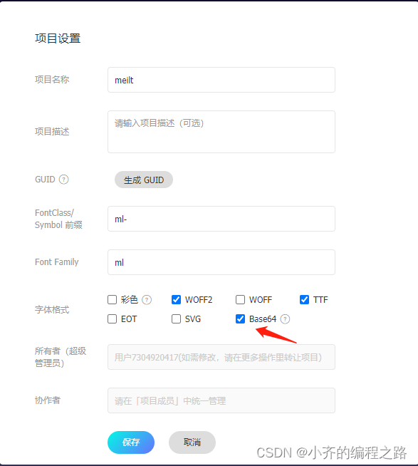 为了在项目中使用方便,可进行修改前缀及font Family,点击保存,注意: 微信小程序不能直接引入,只能引入 base64 的 iconfont,所以这里要勾选Base64,不然引入到项目中将会无法显示。
