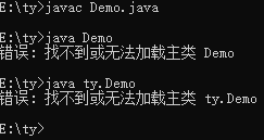 由于我们没有指定classpath,jvm准备在当前路径下查找Demo.class来装载,找了一圈没找到(确实有个Demo类,但是Demo类的完整路径是ty.Demo,所以不是这个),报错找不到或无法加载主类。