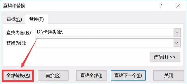 到这一步,就已经得到所有完整的文件名了。 如果不需要文件路径,只要保留文件名称怎么办? 只要一次替换,将文件名替换为空,就能批量删除,得到干干净净的文件名。 ❹ 清除文件路径 打开替换窗口【Ctrl H】,再将文件路径复制粘贴到查找内容一栏,替换为空,然后点击【全部替换】。