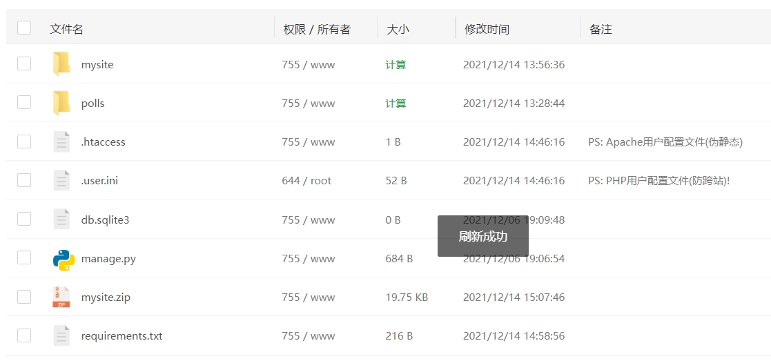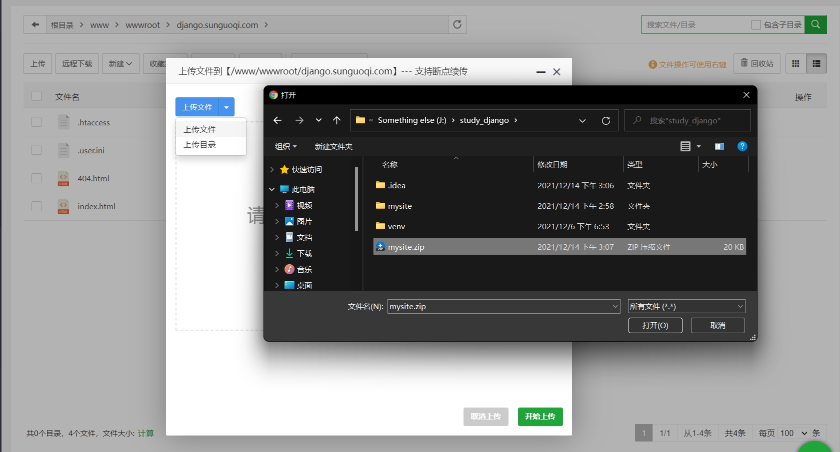 关闭 pycharm,把项目 mysite 做成压缩包,使用宝塔面板上传到网站目录/www/wwwroot/django.sunguoqi.com