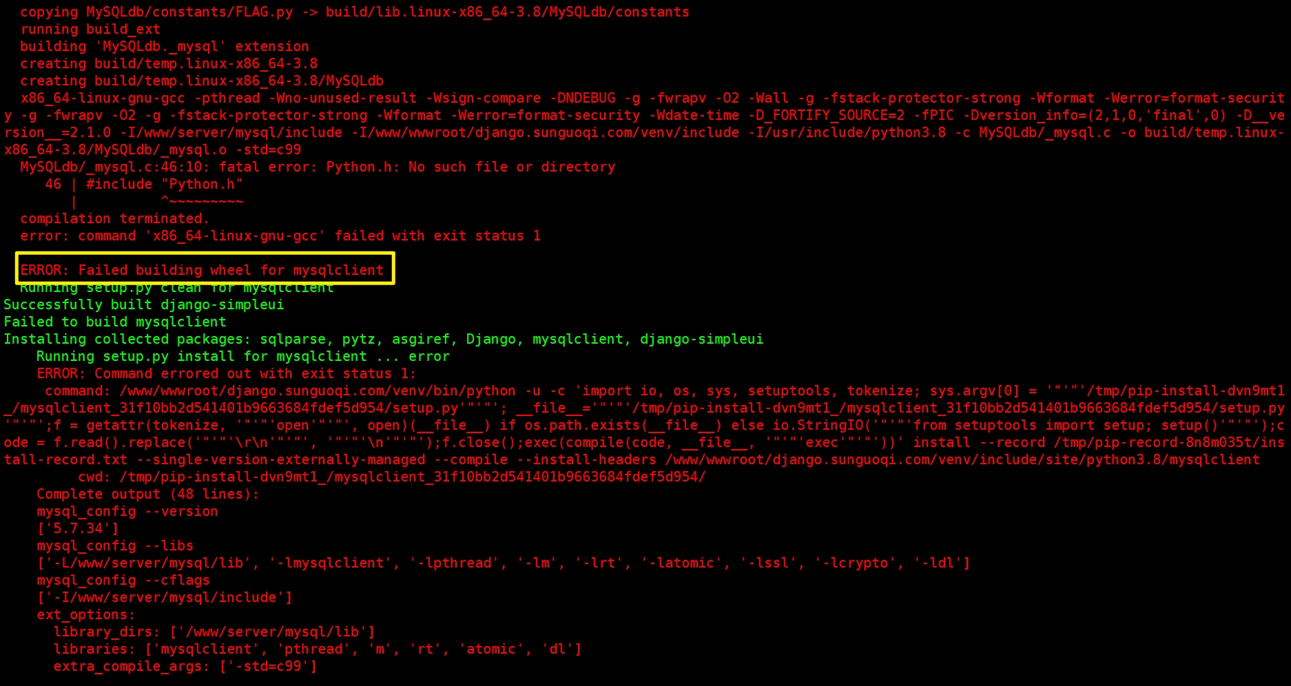 ERROR: Failed building wheel for mysqlclient