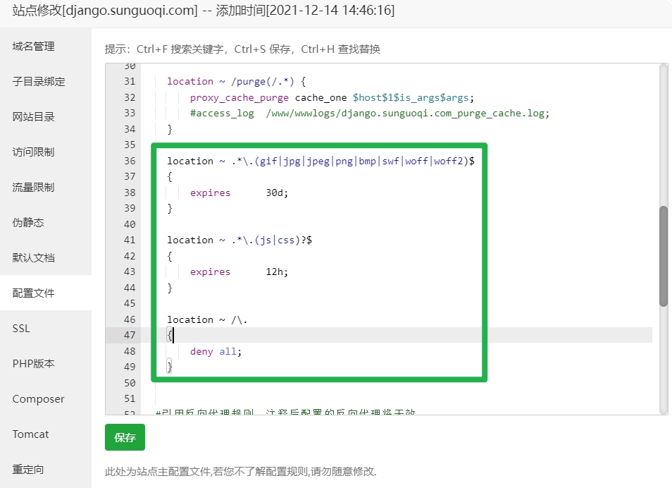 location ~ .*\.(gif|jpg|jpeg|png|bmp|swf|woff|woff2)${expires 30d;}location ~ .*\.(js|css)?${expires 12h;}location ~ /\.{deny all;}