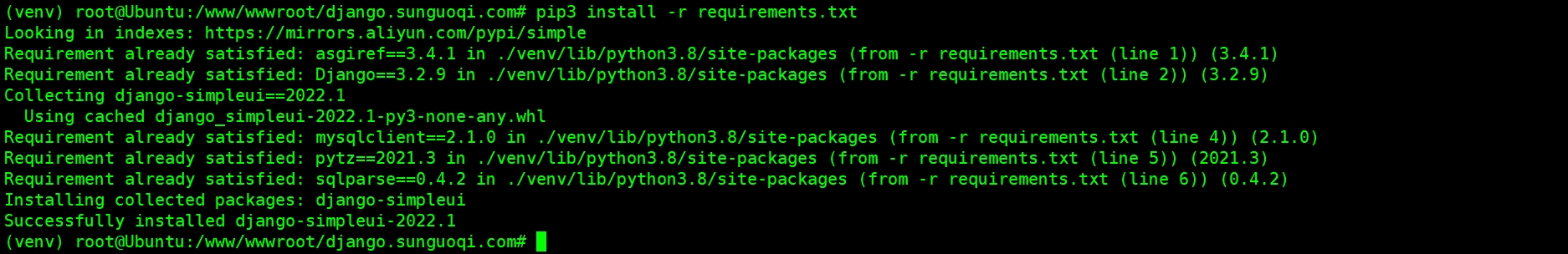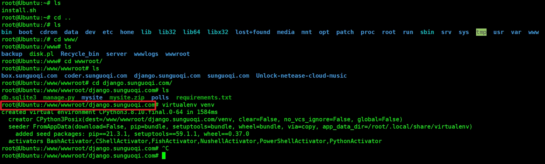 使用 Xshell 远程主机,进入网站目录,执行以下命令安装虚拟环境。