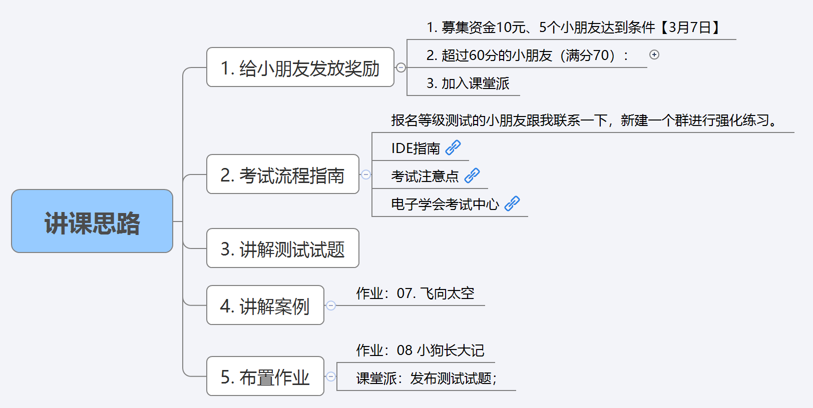 首先,我们奖励了上周小测超过70分的小朋友。其次,我们说明了3月27日等级测试的注意点。再次,我们讲解了上次测试中小朋友们做错的题目。然后,我们演示了如何写“飞向太空”的代码。最后,布置了“小狗长大记”的编程作业。