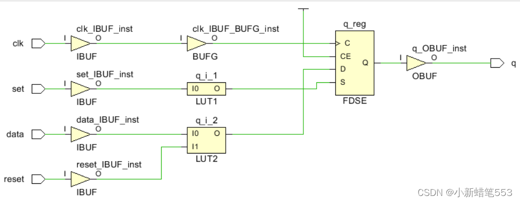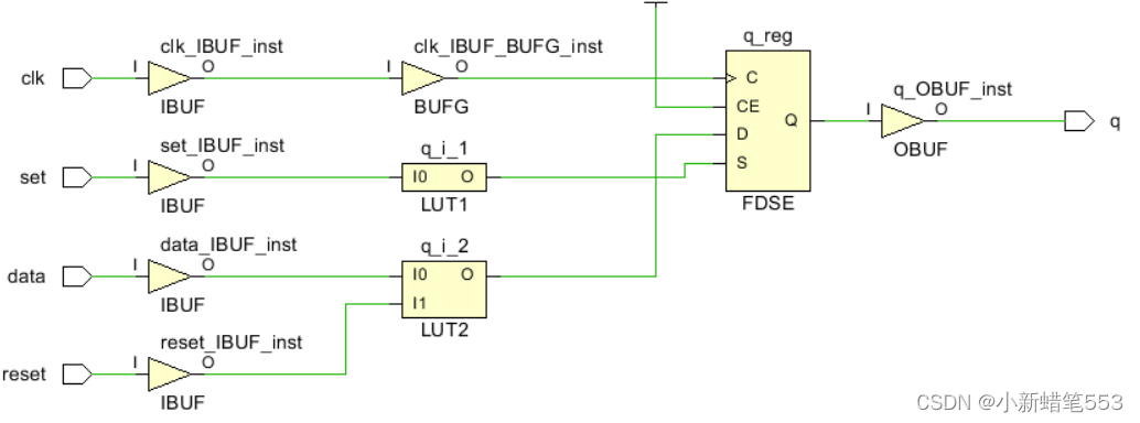 FDSE:D Flip-Flop with Clock Enable and Synchronous Set 带时钟使能和同步置位的D触发器。当置位端为高电平时覆盖所有输出,一个时钟的上升沿触发导致寄存器置位,当置位端为低电平和时钟使能位为高电平时,在一个时钟的上升沿触发导致寄存器装载数据口的数据
