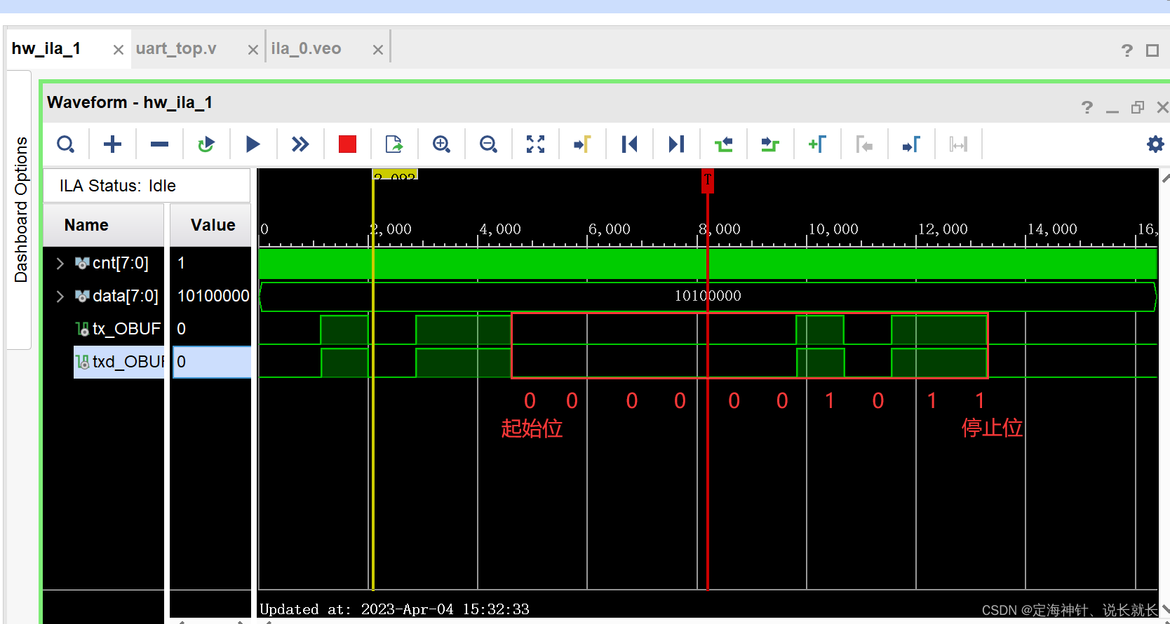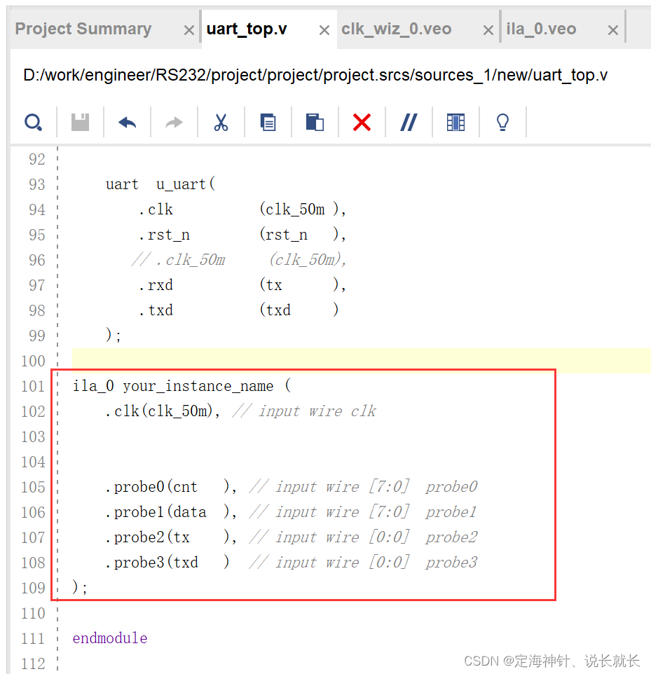 ila_0 your_instance_name (.clk(clk_50m), // input wire clk.probe0(cnt ), // input wire [7:0] probe0 .probe1(data ), // input wire [7:0] probe1 .probe2(tx ), // input wire [0:0] probe2 .probe3(txd ) // input wire [0:0] probe3