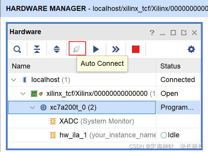 1、将板子连接电源,接着将板子和电脑用下载器连接之后,点击下图的Auto Connect按钮,显示出连接的芯片xc7a200t。