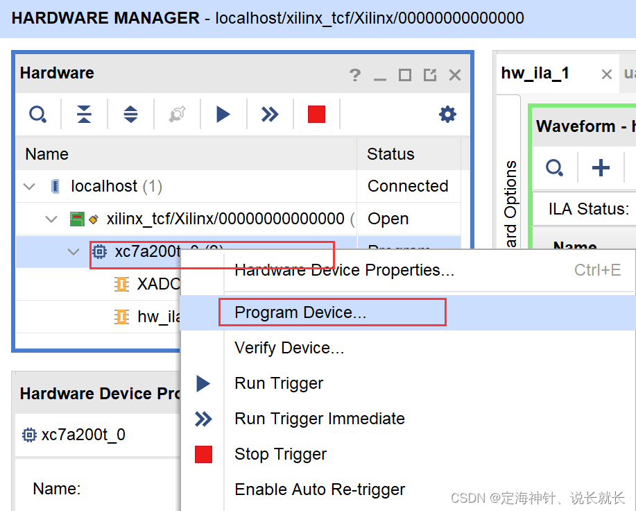 工程创建并添加设计文件完成后,经过管脚约束和时序约束,生成bit文件后连接板子。因为调用ILA IP核需要连接板子才能抓出波形。