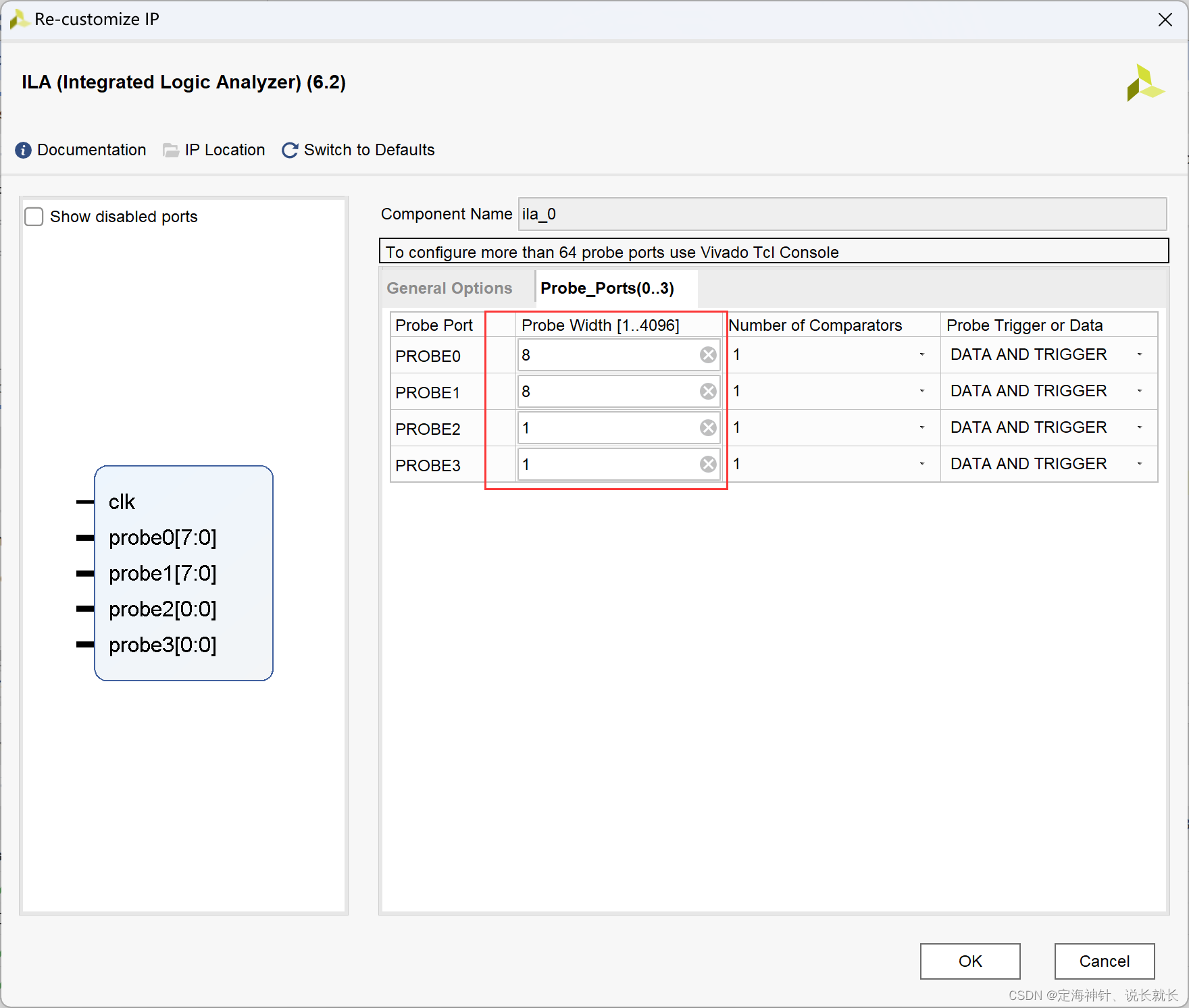 在Probe_Ports页面,设置Probe的宽度,设置PROBE0和PROBE1位宽为8,用于采样cnt和输入的data,设置PROBE2和PROBE3位宽为1,用于采样tx和txd。点击OK。