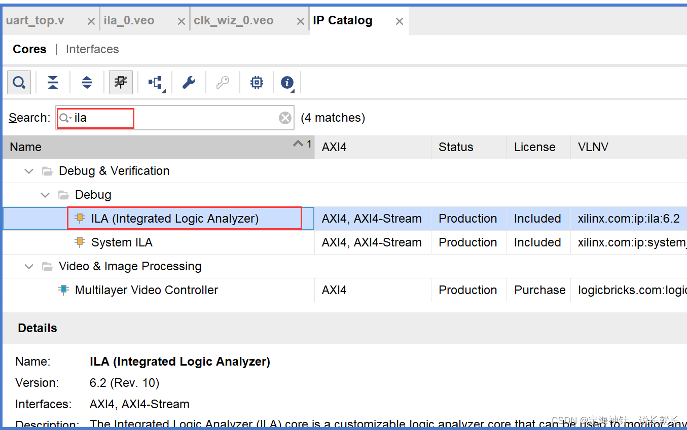 在 IP Catalog 界面搜索 ila,点击搜索出的ILA。