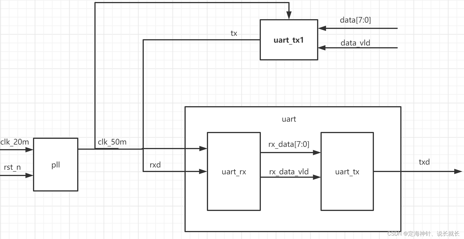 //串口模块uart u_uart(.clk (clk_50m ),.rst_n (rst_n ),// .clk_50m (clk_50m),.rxd (tx ),.txd (txd ));