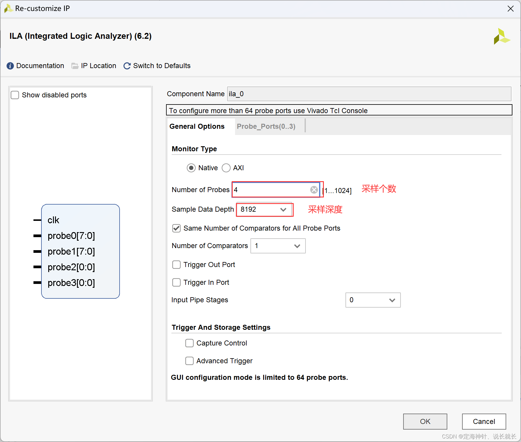由于要采样4个信号,Probes的数量设置为4,Sample Data Depth指的是采样深度,设置的越高,采集的信号越多,同样消耗的资源也会越多。