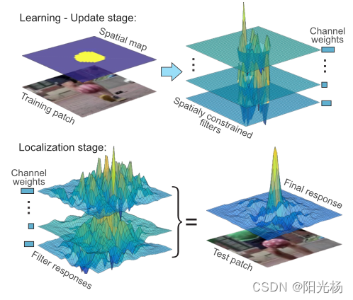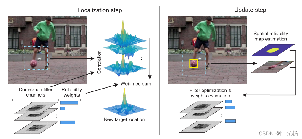 上面一行对应空间可靠性,下面一行对应通道可靠性。空间可靠性利用了一个mask矩阵从而可以实现搜索区域的任意大小,并且文中还采用了图像分割的思想将不规则目标的特征提取出来。