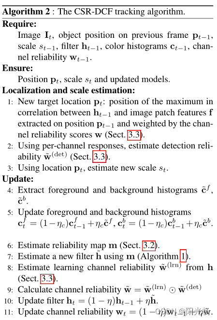 前景和背景直方图c被提取并通过具有学习速率ηc的指数平均衰减来更新。前景直方图由估计的对象边界框内的Epanechnikov核提取,背景从两倍于对象大小的邻域中提取。