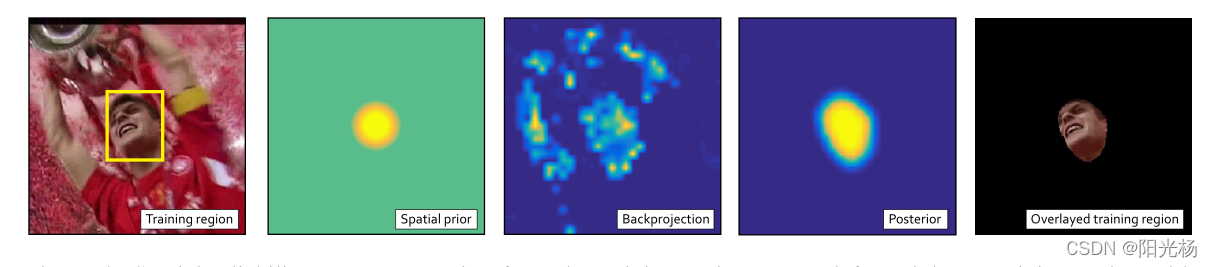 表示搜索区域的位置的概率,也可以叫做空间可能性,靠近目标中间的部分概率大,其他概率很小,对应与第二副图。由于远离中心的像素同样可能属于对象或背景,所以作者利用一个Epanechnikov核函数进行中心位置的加强。