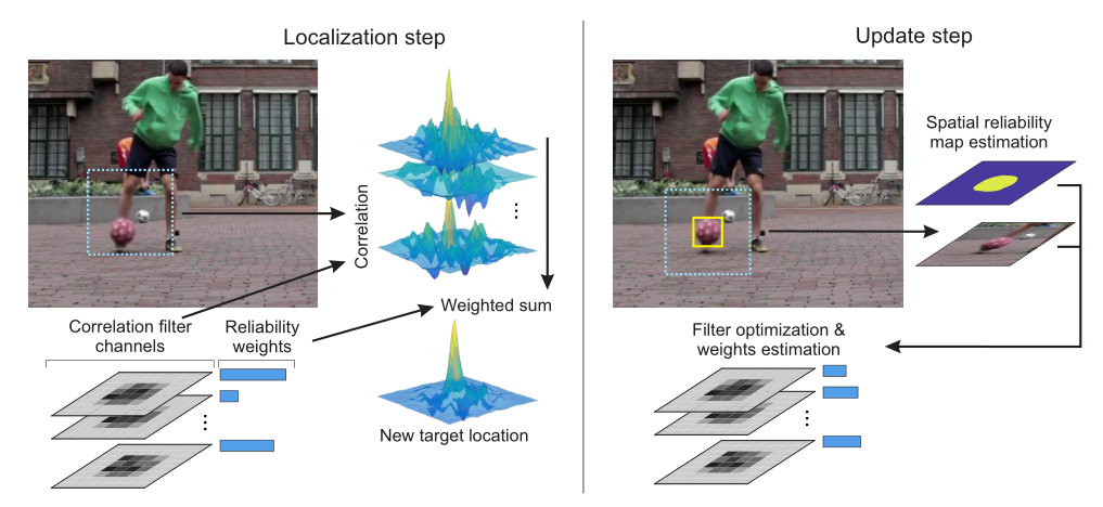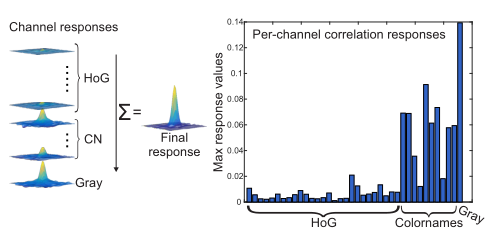 加权的相关响应求和来定位目标。每个通道滤波器响应用于计算相应的检测可靠性值![]()
