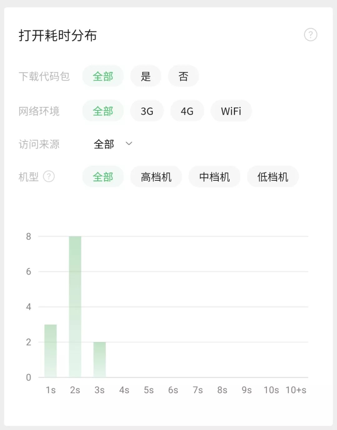 从图中我们可以看到,下载小程序代码包主要集中在2-5秒,此外,部分http请求接口的时间延迟很长,会影响到整体页面的渲染效果。由此可见,存量用户运营“用户端小程序”还有很大的优化空间。