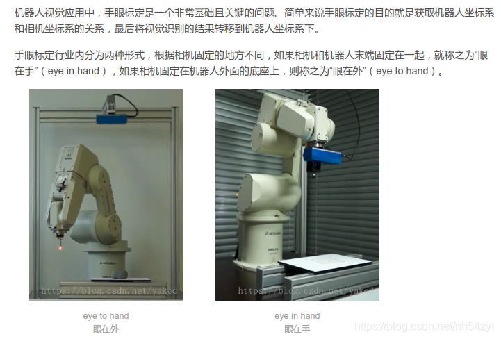 Eye-in-Hand系统的摄像机安装在机器人手部末端(end-effector),在机器人工作过程中随机器人一起运动。 Eye-to-Hand系统的摄像机安装在机器人本体外的固定位置,在机器人工作工程中不随机器人一起运动。