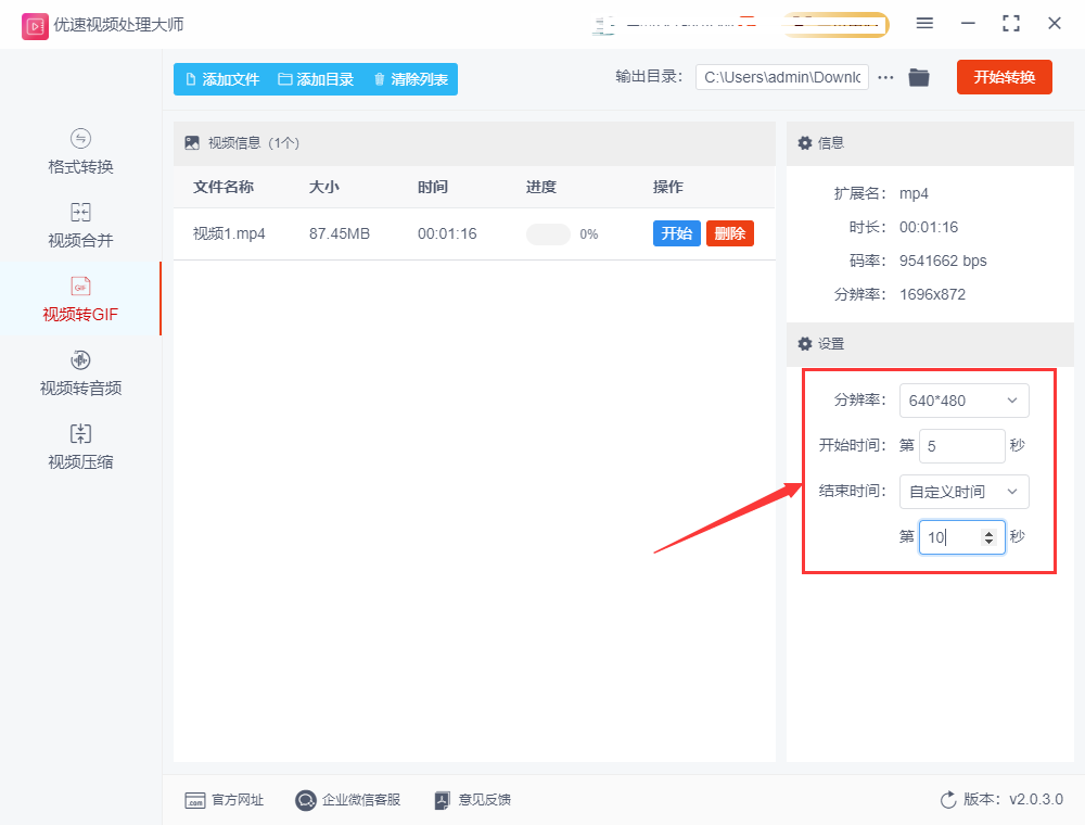 步骤3,当您将视频文件添加至软件界面后,您需要在右侧区域进行相关的设置。首先,您需要设置动图的分辨率大小,然后是时间范围的设置,该时间范围用于截取视频片段并制作成 GIF 动图。这一时间设置非常重要,需要特别注意。