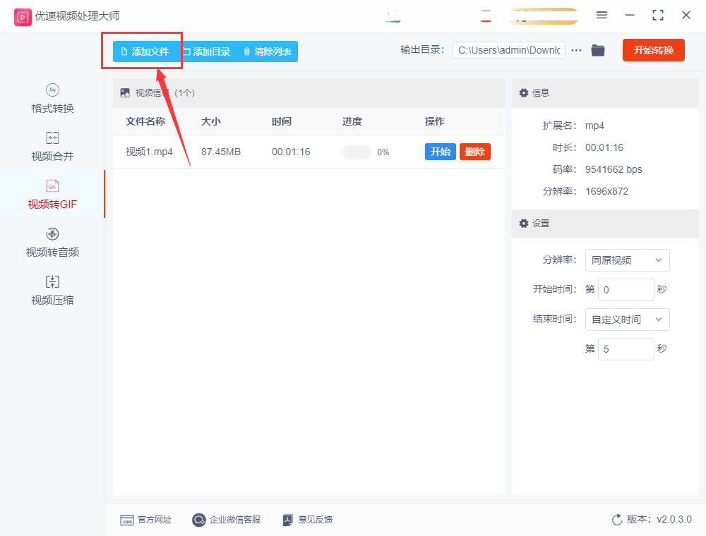 第一步,首先在电脑上打开“优速GIF大师”软件,在左侧找到“视频转GIF”功能并点击它。接着,您需要点击“添加文件”按钮,将需要转换为GIF动图的视频文件添加到软件中。