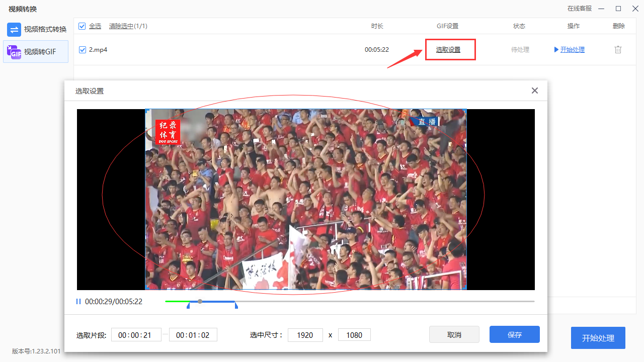 步骤3,上传完成后,看到视频展示在界面上,点击“选取设置”按钮,选取我们做制作的视频片段,然后进行其他参数设置。然后点击“保存”按钮。