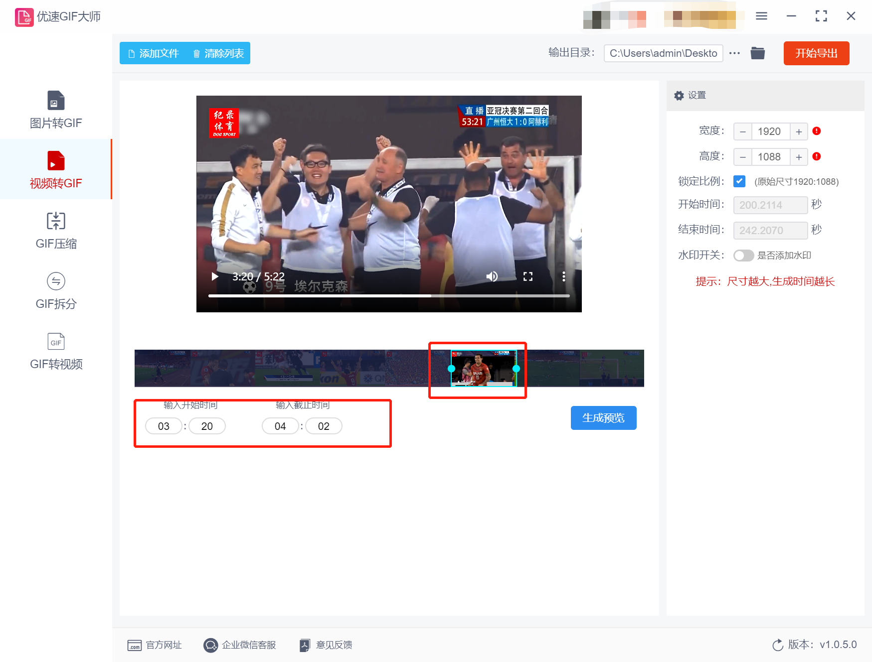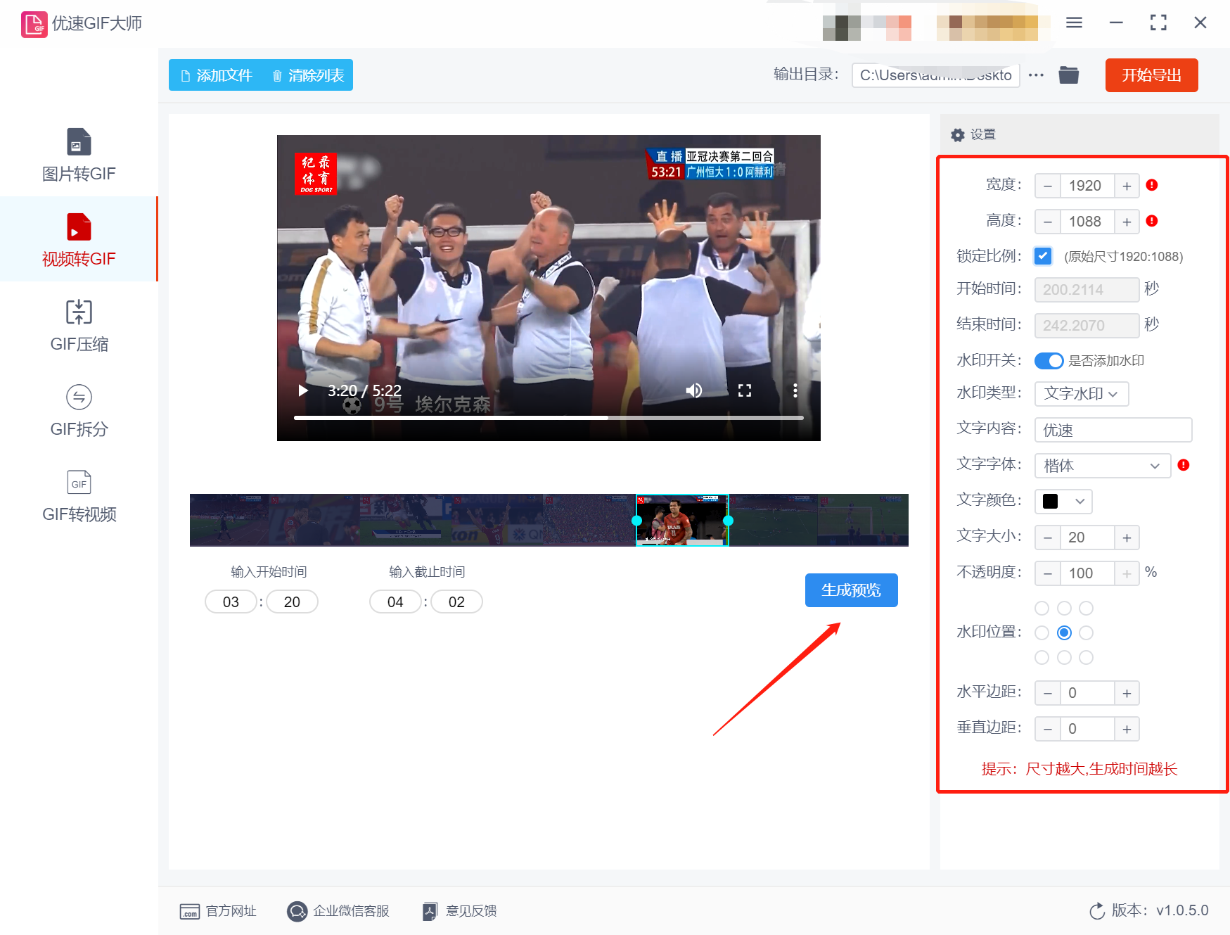 第三步,选择好视频文件后,您需要在右侧设置GIF动图的其他参数。这包括宽度、高度、时间、水印等。同时,您也可以点击“生成预览”按钮,这样会生成一个gif预览图,方便检查自己是否满意。