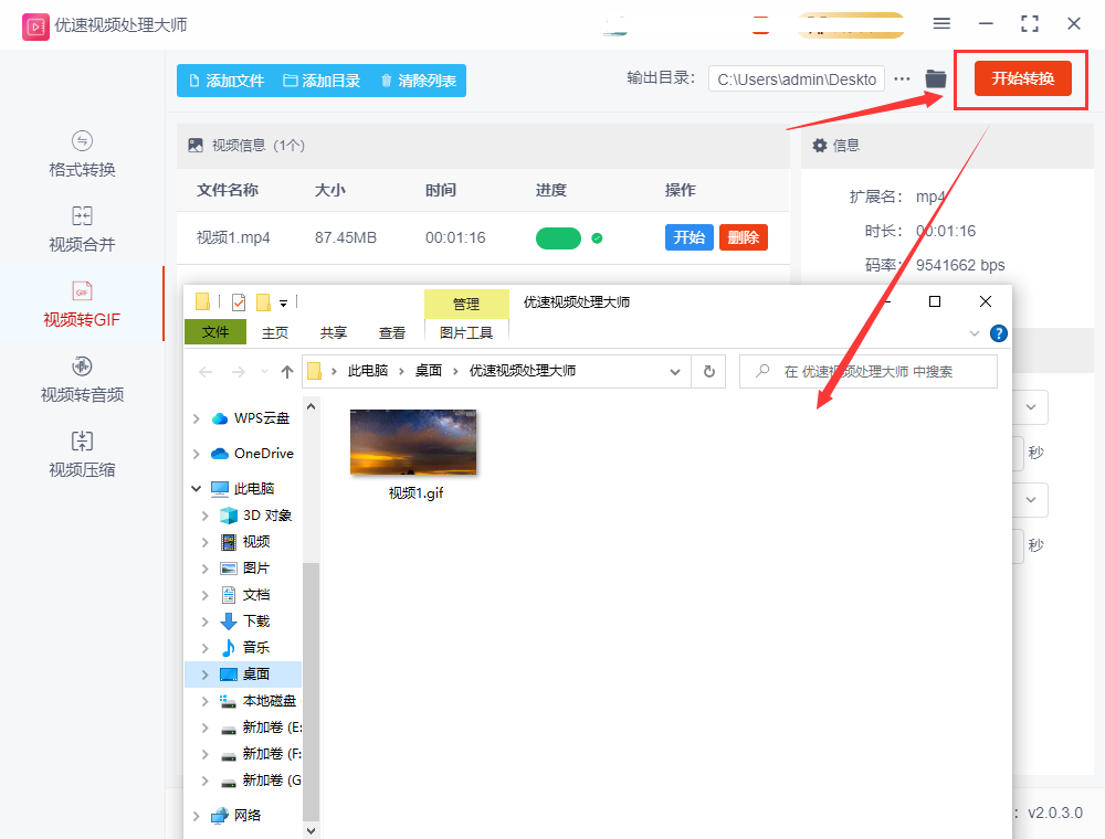 步骤4,在进入视频转换为 GIF 动图的界面之后,您可以直接点击视频区域右侧的“开始处理”按钮。随后,您只需等待一段时间,直至转换操作完成。一旦转换成功,您可以通过点击“打开”按钮来查看该 GIF 动图,也可以前往之前所设置的输出目录中寻找。这个过程非常简单、快速,操作起来非常便利。