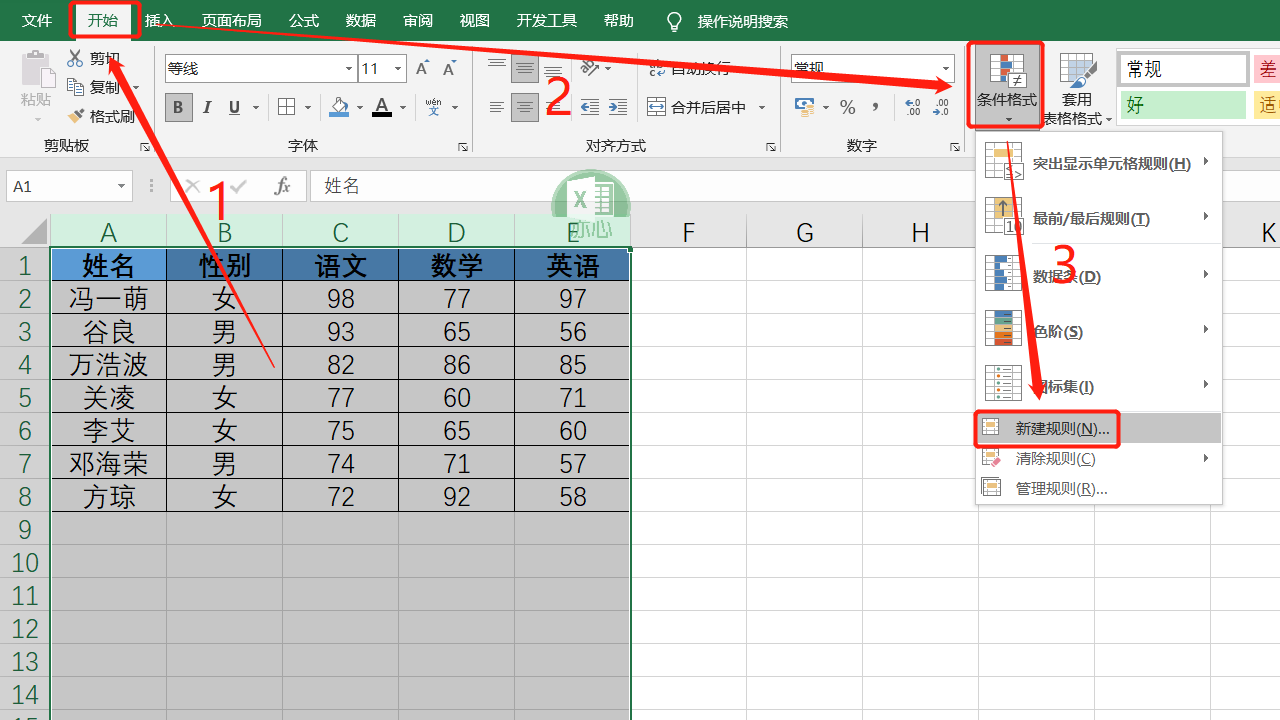 ②点击「开始」选项卡下「样式」命令组下的「条件格式」下拉列表,选择「新建规则」;