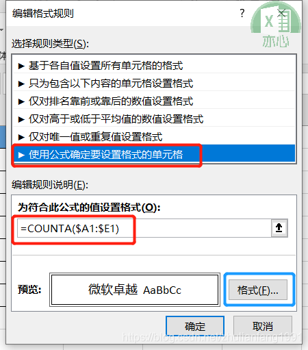 ③然后选择「使用公式确定要设置格式的单元格」,并在「为符合此公式的值设置格式」中输入公式:「=COUNTA($A1:$E1)」,然后点击「格式」;