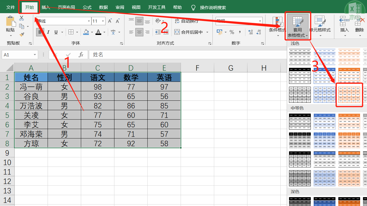 操作也十分简单,首先选择数据A1:E8单元格区域,然后点击「开始」选项卡下「样式」命令组下的「套用表格样式」下拉列表,任意选择一个自己喜欢的样式。