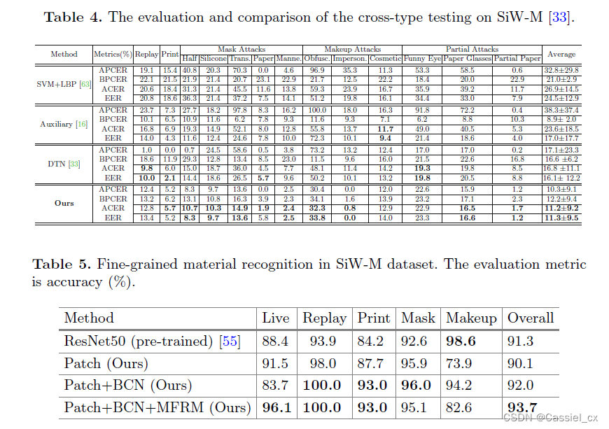 虽然在原始 RGB 图像中真人与假体具有相似性,但它们的双边基础图像和残差图像存在明显差异。如上图 (b) 所示,纸质材料的打印攻击面更粗糙,光泽度更低。此外,从上图 (b)、(c) 可以看出,眼睛和眉毛区域的高频激活更强,这可能是由于材料 (如皮肤、 纸和玻璃),因此来自双边基础的宏观线索和来自双边残差的微观线索有助于材料感知。