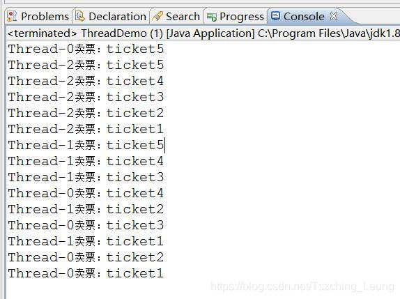 以上程序通过继承Thread类实现了多线程,程序中启动了3个线程,但是3个线程却各自卖出了5张票,而不是一共卖出5张票达到资源共享的目的。