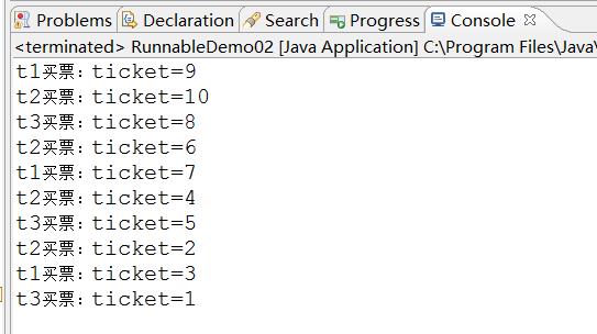 从程序的运行结果可以清楚的发现,虽然以上程序启动了3个线程,3个线程一共才卖出10票,即ticket的属性被所有的线程对象共享。