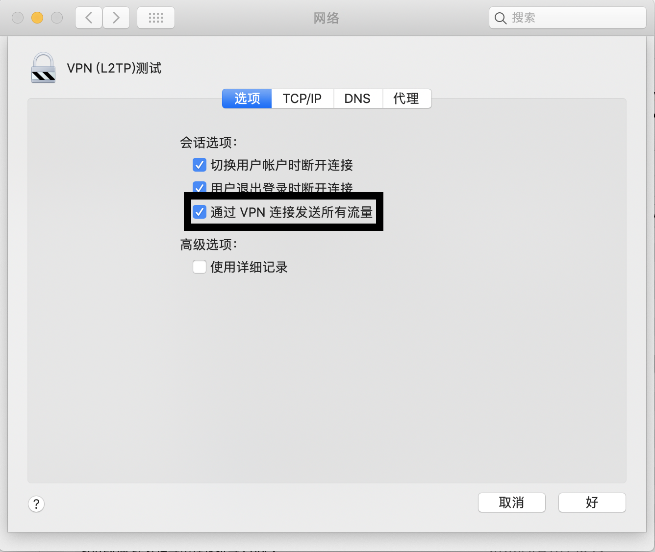 6. 点击'网络'对话框中的'高级'按钮, 并且在弹出的对话框中勾选'通过***连接发送所有流量'选项, 在单击'好'按钮.